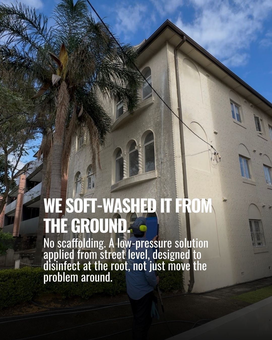 We soft-washed the entire building from the ground using specialised solutions that remove and disinfect organic growth at the root.